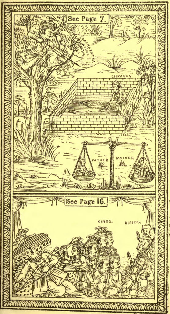 Then Shravan said to him, “I shall not now live. Please, therefore, take some water in this goblet and give it to my parents, as they are very thirsty; and as soon as I hear that they have quenched their thirst, I shall instantly die. They are very old and cannot walk; I carry them in a kavada across my shoulder. Oh, my good king, take care of these poor creatures. There is no one to look after them.” Dasharatha sighed and wept, but the loss was irreparable. The king then took some water in the goblet and stood where the kavada was placed without speaking a word. The old woman and the man, who were blind, taking him for Shravan, said, “Child, why dost thou not speak? Art thou angry with us because we sent thee to the lake at this hour? Child, thou art always obedient to us, and what has irritated thee today?”