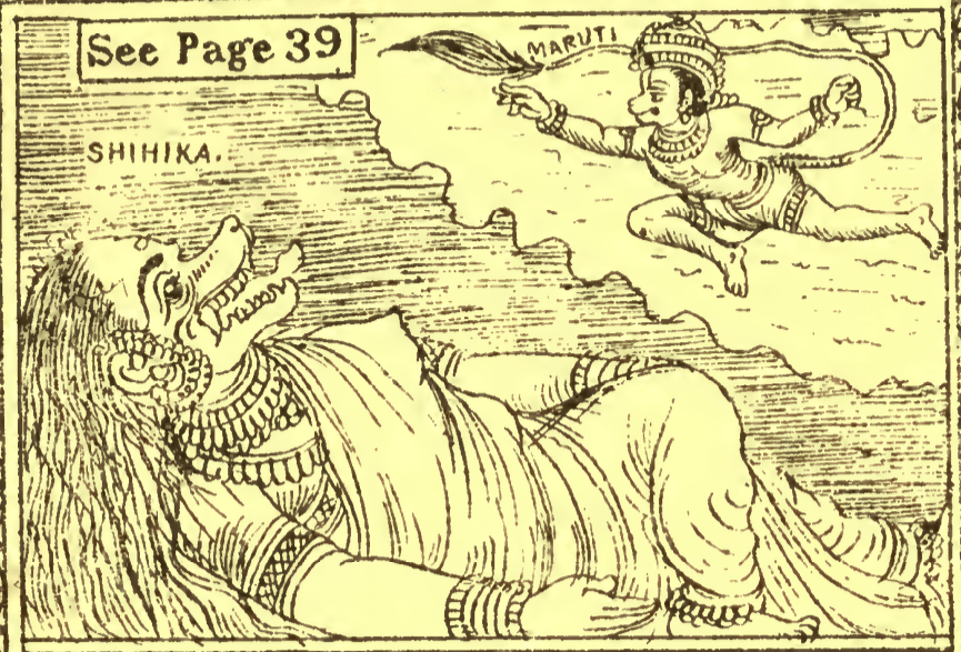 A little further on, a frightful demoness, Simhika, who was the mother of Rahu and Ketu, swallowed him up; but he tore off her belly and came out. At last he arrived at Upper Lanka, when the goddess of the place caught hold of his legs and knocked him down. He got up and gave her mortal blows, when she implored him to spare her life. He, having granted her request, was blessed by her, saying that he would be successful in his undertaking.