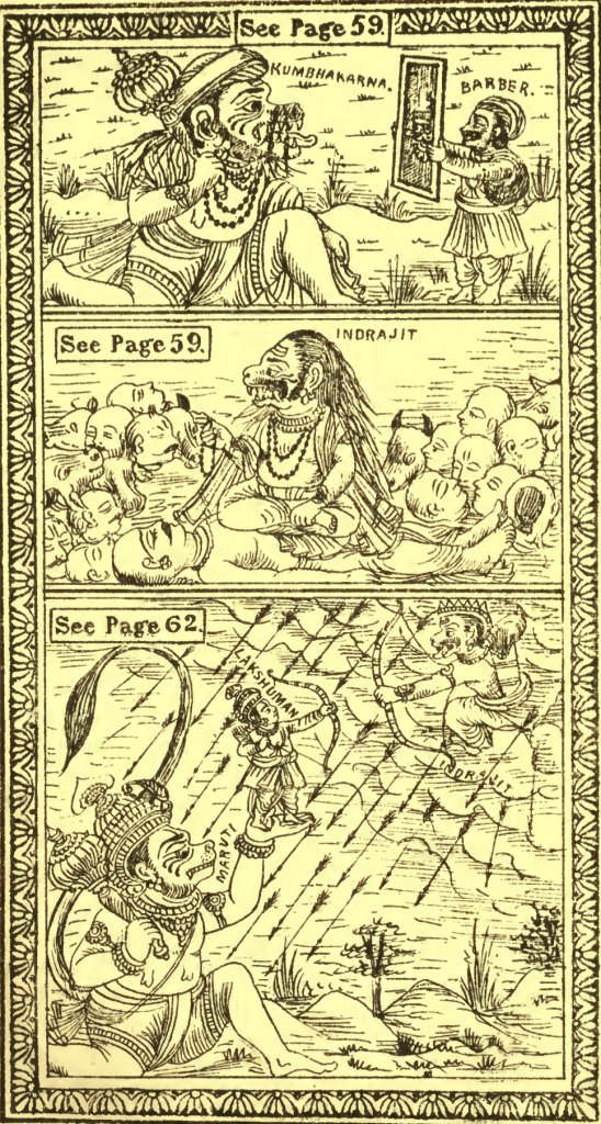 “As you are my brother,” said Kumbhakarna, “it is my duty to help you. Have courage. I shall devour all the monkeys at once and slay Rama and Lakshman.”